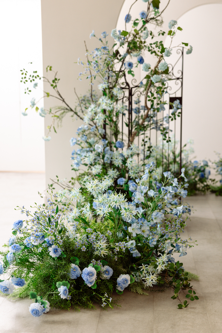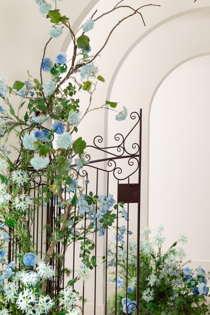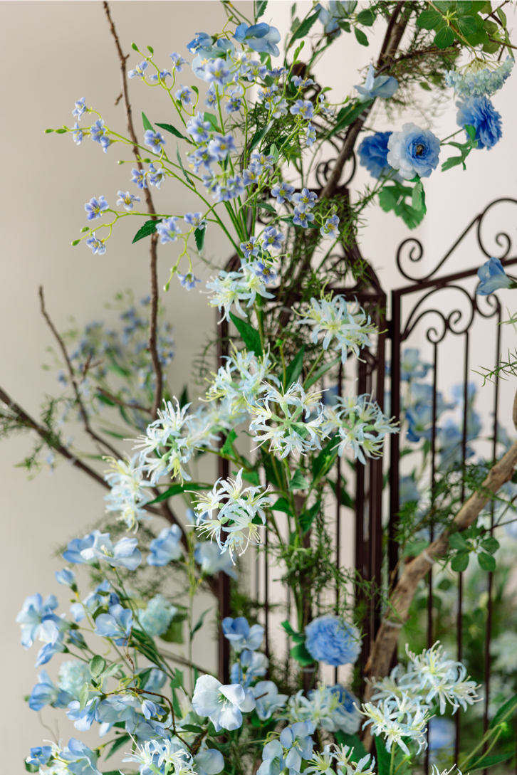 Make a grand, unforgettable entrance with a floral covered gateway set designed to captivate. An ornate steel gate is enveloped in airy, cascading blooms, featuring delicate blue spring florals woven through lush greenery and sculptural branches. The result is a romantic, editorial garden backdrop that feels soft, elevated, and effortlessly luxurious, created to stand out in every frame.